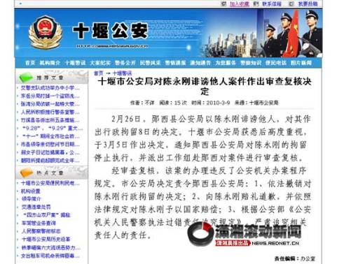 2月26日,鄖西縣公安局以陳永剛誹謗他人,對(duì)其作出行政拘留8日的決定。十堰市公安局獲悉后高度重視,于3月5日作出決定,通知鄖西縣公安局對(duì)陳永剛的拘留停止執(zhí)行,并派出工作組赴鄖西對(duì)案件進(jìn)行審查復(fù)核。