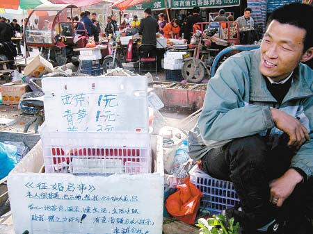 余東陽說,自己老家在河南,今年30歲,曾到廣東打工,去年來寶雞做賣菜的小生意。父母年紀(jì)大了,一直盼著他趕快結(jié)婚,但他在寶雞沒有親友,沒人給他介紹,每天做生意又沒時間結(jié)識異性朋友,于是他就有了邊賣菜邊征婚的想法!笆袌隼锶肆髁看,而且來買菜的中老年人多,他們和我父母一樣,能理解我的心情,用這種方式征婚,知道的人多又不耽誤生意,說不定就碰上好的了!毙∮嗾f,每天都有很多人問他征婚的事,但還沒有人正式給他介紹。
