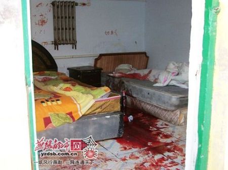 據(jù)旅店老板介紹,12日下午三點(diǎn)多,她看到小明小亮居住的房間門前有幾個(gè)血腳印,心里想這是怎么了,就上前敲門,里面的人不開門,她繼續(xù)敲門,門終于開了,她也被眼前的場(chǎng)景驚呆了:“屋子里的血流了一地,其間還夾雜著醉酒的嘔吐物,大片的血跡中間是兩個(gè)啤酒瓶子。兩個(gè)男孩一個(gè)蹲坐在地上,一個(gè)坐在床上,一邊墻上用血寫著‘XX,我愛你’,一邊寫著‘我錯(cuò)了,我愛你……’ ”