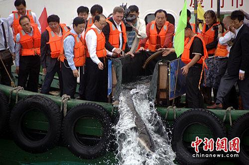 中新社廈門4月22日電 (記者 陳悅)22日下午,廈門在九龍江雞嶼海域放流108尾有“魚類活化石”之稱的中華鱘。其中四只在海洋公園保育基金贊助下,首度配上“衛(wèi)星追蹤信標(biāo)”,相關(guān)專家表示,這將是中華鱘研究及保育的一大突破,將開展有效保育中華鱘新的一頁。