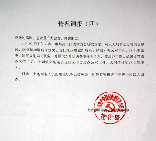 27日,漯河市源匯區(qū)委宣傳部通報(bào)說,中共源匯區(qū)委常委會(huì)研究決定,對(duì)原大劉鄉(xiāng)黨委書記史洪濤、副書記楊耀勤分別免去現(xiàn)任區(qū)政府黨組成員、區(qū)政府辦公室主任,區(qū)紀(jì)委常委、監(jiān)察局副局長職務(wù);對(duì)原大劉鄉(xiāng)信訪辦主任陳會(huì)軍、政法辦工作人員宋長興責(zé)令區(qū)信訪局、大劉鎮(zhèn)分別免去現(xiàn)任區(qū)信訪局辦公室主任、大劉鎮(zhèn)計(jì)生辦主任職務(wù)。目前,上述四名人員的現(xiàn)任職務(wù)已被免去。