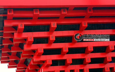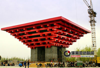 帖子描述說(shuō),這座紅色的建筑高24米,四方形的平臺(tái)邊長(zhǎng)50米。上部是四方冠形結(jié)構(gòu),外頂部邊長(zhǎng)43米,其6層架空層全部為鋼架結(jié)構(gòu);下面還有四個(gè)鋼筋混凝土大立柱。整個(gè)建筑在結(jié)構(gòu)、色調(diào)和外形等方面都和世博會(huì)中國(guó)館相似。
