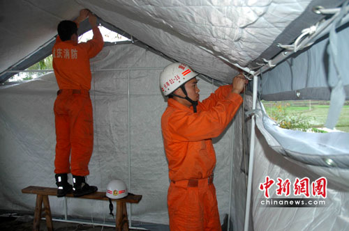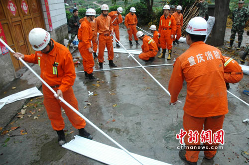 在重慶市墊江縣李白村九組,一頂藍(lán)色的救災(zāi)帳篷經(jīng)過消防官兵的緊張搭建成形,災(zāi)民湯強(qiáng)上前與消防官兵們緊緊握手,感激得熱淚盈眶……