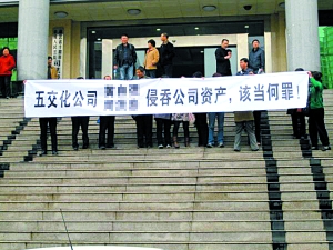 近30名十堰市原五交化有限公司下崗職工,從報紙上得知,省里下來的巡視小組住在宏正酒店,便于4月9日上午聚集在宏正酒店門口,打出橫幅反映公司改制國資流失和原單位領導涉嫌腐敗問題。