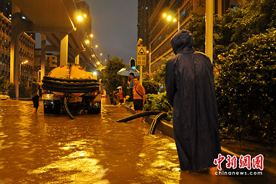 在“水浸黑點(diǎn)”之一中山一路現(xiàn)場(chǎng),有多位環(huán)衛(wèi)工人被臨時(shí)抽調(diào)過(guò)來(lái)協(xié)助排水,其中一位工作人員黃叔對(duì)筆者說(shuō):“雨下的這么大,市政也沒(méi)有辦法,只能派抽水車過(guò)來(lái)協(xié)助排水,已經(jīng)來(lái)回好幾趟了,但是還沒(méi)能那么快抽完。這水還不知道什么時(shí)候才能退!薄拔覀兪桥R時(shí)抽調(diào)過(guò)來(lái)協(xié)助排水的,已經(jīng)加班了好幾個(gè)小時(shí)了!秉S叔一臉無(wú)奈的說(shuō)。