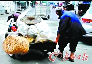 在穿梭的車流中,陳老伯弓著腰,吃力地拉著歪歪扭扭的平板車在大馬路上緩慢前行,車輛在他身邊飛馳而過,老人究竟要去哪里呀?“我要拉去清新縣逕口,要走3個(gè)小時(shí)啊,”從老伯含糊不清的言語中,記者得知,原來這對(duì)年齡加起來160歲的老夫妻每天凌晨3時(shí)多就要起身,從20多公里外的城郊拉車徒步進(jìn)城,到了市場(chǎng)已經(jīng)天亮,接著他們分頭去揀一些爛菜葉等裝好車,再一路拉回去喂豬,到了家里已是月上梢頭。一個(gè)8旬老伯拉著平板車從松崗市場(chǎng)去清新逕口,就算是一個(gè)正常人行路,也要走幾個(gè)小時(shí),別說是拉車了。陳伯的舉動(dòng)吸引了不少人的好奇的目光,他為何要這樣折磨自己?
