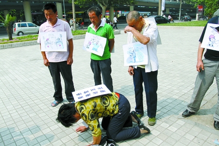 正當(dāng)人們念著漫畫里諷刺滑稽的對(duì)話時(shí),一中年女子突然跪倒在地,嘴里念叨著:“當(dāng)法官也不能恁黑心啊,黑的都是我們這些農(nóng)民工的血汗錢,求求好心人幫幫我們吧。”
