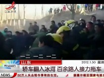 實(shí)拍:轎車墜入冰河 百余路人齊力拖車救人