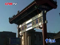 【解說】除了這條巨大的龍燈外,今年運河廣場的入口處還有一座高7米寬16米的牌樓,兩條五彩祥龍高高盤坐在牌樓上,寓意“躍龍門”,與盤龍燈組相呼應。