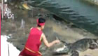鱷魚馴養(yǎng)員正表演 隊友突滑倒嚇壞人