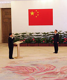 6月24日上午9時(shí),香港特區(qū)行政長官曾蔭權(quán)就職儀式在人民大會(huì)堂香港廳舉行。曾蔭權(quán)向溫家寶總理宣誓就職。溫家寶總理向曾蔭權(quán)頒發(fā)了中央人民政府任命書