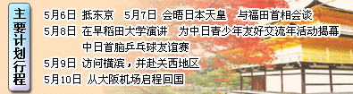 5月6日-10日,中國(guó)國(guó)家主席胡錦濤對(duì)日本進(jìn)行了為期五天的國(guó)事訪問(wèn)。[詳細(xì)]