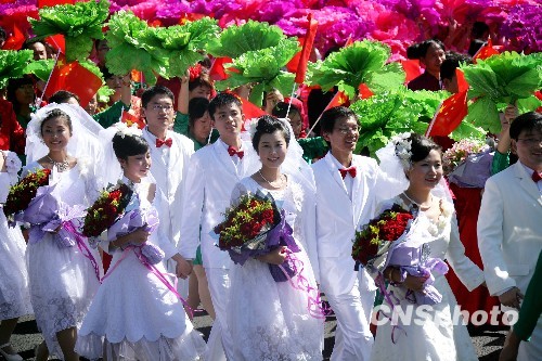 圖:30對(duì)新婚夫婦亮相群眾游行隊(duì)伍