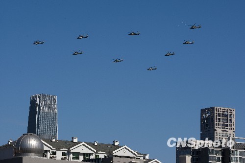 國(guó)慶閱兵:直升機(jī)梯隊(duì)飛過(guò)北京上空