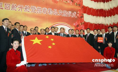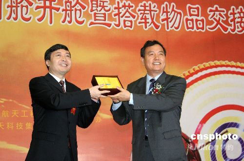 圖:“神七”載人飛船總設(shè)計(jì)師張柏楠移交返回艙搭載簽名旗幟