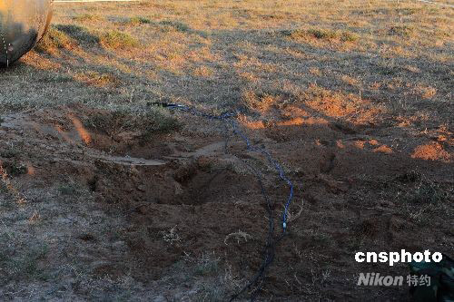 圖:神七返回艙底部反推點(diǎn)火在地面形成的四個(gè)坑