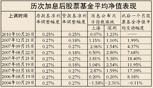 而據(jù)記者測算,在上輪8次加息之后的1個(gè)月,除2004年低迷市道中,其余7次加息后的一個(gè)月股票基金的平均凈值也均報(bào)上漲。 (見表)
