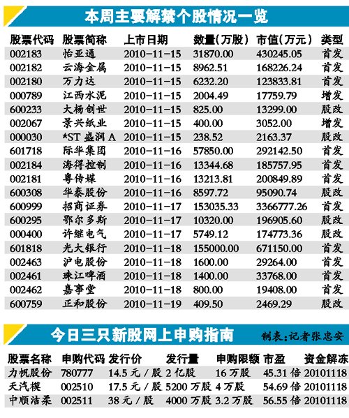 根據(jù)上海財匯數(shù)據(jù),本周兩市共有19家公司的解禁股上市流通,兩市解禁股共計46.19億股,解禁市值約603億元,同上周相比大幅下降(見表)。