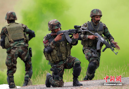7月4日,“友誼—2010”的中國(guó)巴基斯坦反恐聯(lián)合訓(xùn)練在中國(guó)寧夏青銅峽地區(qū)展開(kāi),此次訓(xùn)練主要以邊境地區(qū)山地聯(lián)合反恐作戰(zhàn)為課題,分為展示交流、混編同訓(xùn)、綜合演練三個(gè)階段。圖為反人質(zhì)劫持演練。中新社發(fā) 杜洋 攝