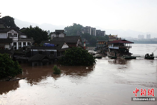 7月19日,今年入汛以來最大洪峰經(jīng)過重慶主城,長江、嘉陵江水位上漲。記者在重慶古鎮(zhèn)磁器口看到,從磁器口江邊至磁器口街道的梯坎已“隱”于水面下,標(biāo)志性牌匾龍隱門沒至“腰部”,靠近江邊的商鋪及民居被淹。目前,大部分商家、市民接預(yù)警已提前撤場歇業(yè)或撤離至安全地帶。截至記者趕赴磁器口途中,部分必經(jīng)路段已實施交通管制,磁器口正街漲水期間亦采取禁行措施。據(jù)長江水利委員會水文局監(jiān)測數(shù)據(jù),19日20時長江重慶寸灘站水位超過185米,這是重慶遭遇的長江今年以來最大洪峰。截至20日0時,長江重慶水位仍在185.06米的峰值上流動,洪峰仍在過境重慶。 劉函冉 攝