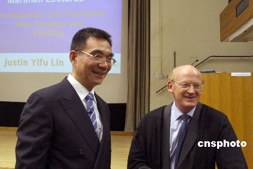 世界頂級經(jīng)濟(jì)學(xué)講壇之一的劍橋大學(xué)“馬歇爾講座”每年邀請一位世界著名經(jīng)濟(jì)學(xué)家擔(dān)任主講人,北京大學(xué)中國經(jīng)濟(jì)研究中心林毅夫教授作為首個(gè)中國學(xué)者今年應(yīng)邀主講。中新社發(fā) 李鵬 攝