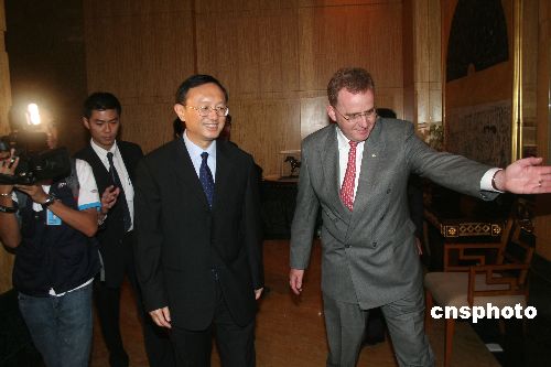 十二月七日傍晚,中國(guó)外交部長(zhǎng)楊潔篪自倫敦飛抵吉隆坡,開始其就任外長(zhǎng)后的首度訪馬行程。在馬方接待人員和中國(guó)駐馬大使程永華等中方人員陪同下,面無(wú)倦色的中國(guó)外長(zhǎng)進(jìn)住緊鄰吉隆坡標(biāo)志物雙峰塔的東方文華酒店,受到酒店總經(jīng)理舒曼(圖右)歡迎。中新社發(fā) 蘇祥新 攝