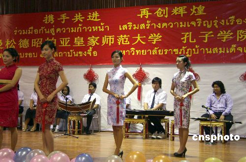 泰國曼松德昭帕亞皇家?guī)煼洞髮W孔子學院十九日在該校隆重舉行孔子學院成立周年慶典活動,慶典儀式后泰中兩國學生以“多元文化的融合,和諧世界的構建”為主題共同表演了一場精彩的文藝演出,圖為泰中兩國學生的旗袍服裝表演。中新社發(fā) 顧時宏 攝