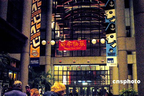 當(dāng)?shù)貢r間二月二日,姚明率領(lǐng)的休斯敦火箭隊作客密爾沃基布拉德利球館,客場以九十一比八十三險勝另一名中國球員易建聯(lián)所在的雄鹿隊,獲得三連勝。為了迎接這場“姚易大戰(zhàn)”,布拉德利中心看上去更像是一個“廟會”,到處可見“新年快樂”的漢語條幅。中新社發(fā) 李靜 攝