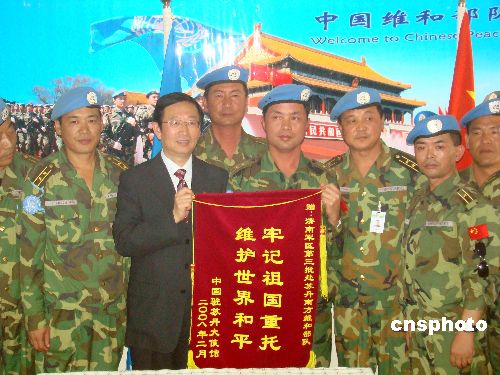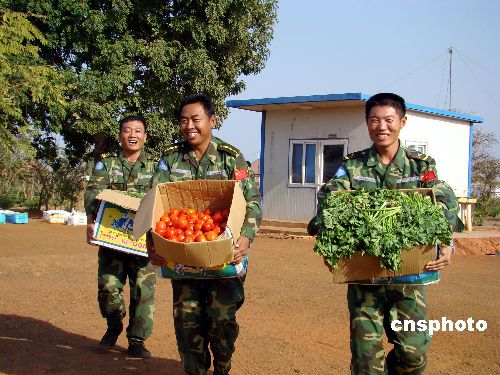 當(dāng)?shù)貢r(shí)間2月3日下午,中國駐蘇丹大使李成文在董建東武官的陪同下,帶領(lǐng)中國石油天然氣集團(tuán)公司代表一行5人乘專機(jī)前往蘇丹南部城市瓦烏,慰問中國駐蘇丹維和工兵、運(yùn)輸、醫(yī)療分隊(duì)。李大使代表中國駐蘇丹大使館向維和部隊(duì)贈送一面鑲有“牢記祖國重托、維護(hù)世界和平”字樣的錦旗及慰問品。隨同的中國石油天然氣集團(tuán)公司代表向維和部隊(duì)贈送1000余公斤新鮮蔬菜。中新社發(fā) 劉恩海 攝