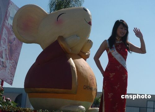 新屆華埠小姐在吉祥鼠卡通前與各族裔民眾歡度中國正月新年。