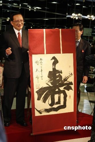 中國國務委員唐家璇2月20日下午抵達日本后即趕往日本松山芭蕾舞團,拜訪為中日友好曾作出過突出貢獻的該團創(chuàng)始人清水正夫和松山樹子夫婦、及該團現(xiàn)任總代表清水哲太郎、團長森下洋子等。圖為唐家璇在松山芭蕾舞團獲贈大幅“壽“字書法作品。中新社發(fā) 朱沿華 攝
