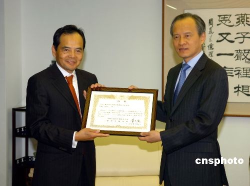 3月6日下午,日本零售業(yè)巨頭之一永旺集團董事長兼總經(jīng)理岡田元也來到中國駐日大使館,委托使館向中國臥龍熊貓基地捐款2500萬日元。圖為接受捐款后,中國駐日大使崔天凱(右)向?qū)镌?左)頒發(fā)獎狀。中新社發(fā) 滕劍峰 攝