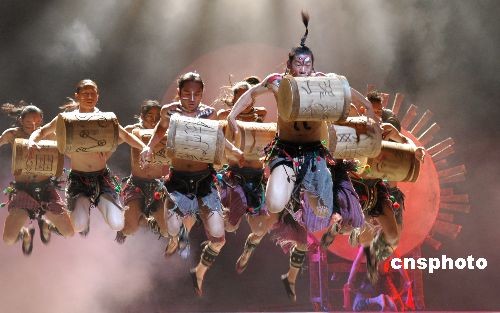 3月14日晚,在中國引起巨大轟動的大型原生態(tài)歌舞集《云南映象》在日本的時尚策源地澀谷的文化村舞臺上演,其藝術總監(jiān)楊麗萍隨之成為媒體追逐的焦點。圖為《云南映象》的第一幕《太陽》演出中的場景。中新社發(fā) 朱沿華 攝