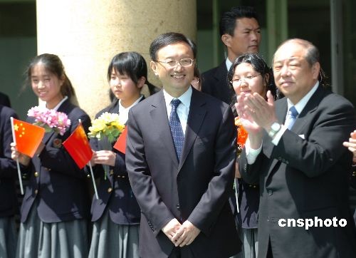 4月19日上午,正在日本訪問的中國外交部長楊潔篪前往橫濱中華學(xué)校參觀訪問,受到這所百年華校全體師生及橫濱地區(qū)各界僑領(lǐng)的熱烈歡迎。圖為楊潔篪外長與中華山手學(xué)校潘民生(右)在歡迎儀式上。中新社發(fā) 朱沿華 攝