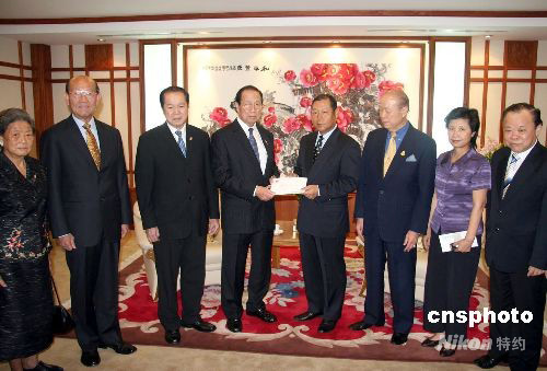 中國(guó)四川省發(fā)生強(qiáng)烈地震的災(zāi)情一直令泰國(guó)的華人華僑社團(tuán)牽掛與關(guān)切。十四日上午,泰國(guó)八個(gè)華人華僑社團(tuán)及知名僑領(lǐng)紛紛前來(lái)中國(guó)駐泰國(guó)大使館,向地震災(zāi)區(qū)人民捐助款項(xiàng)共計(jì)一千零四十萬(wàn)泰銖和一百萬(wàn)元人民幣。中新社發(fā) 顧時(shí)宏 攝