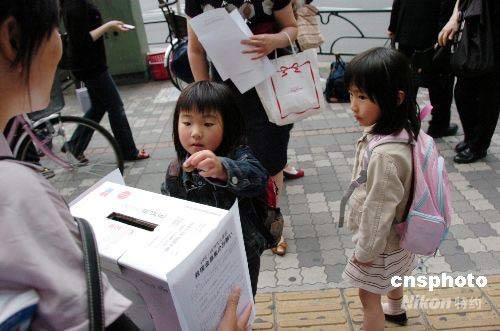 5月18日,一位日本小朋友為四川大地震災(zāi)區(qū)捐款。當(dāng)日,日本僑報(bào)社創(chuàng)辦的星期日漢語(yǔ)角舉行第40次交流會(huì),主題為“向四川震區(qū)人民獻(xiàn)愛(ài)心”募捐和義賣(mài)活動(dòng)。漢語(yǔ)角參加者來(lái)到繁華的池袋車站進(jìn)行街頭募捐,全力支援中國(guó)抗震救災(zāi)。中新社發(fā) 段躍中 攝
