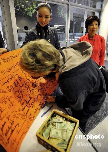 當(dāng)?shù)貢r(shí)間五月二十二日晚間,第五屆舊金山國(guó)際藝術(shù)節(jié)在舊金山芳草地藝術(shù)中心開幕。原中央芭蕾舞首席演員侯宏瀾和美國(guó)舞者瓊斯擔(dān)綱的芭蕾舞劇《傾城之戀》作為首演節(jié)目登場(chǎng)。家在成都的侯宏瀾心系正在抗震救災(zāi)的家鄉(xiāng)父老,在劇場(chǎng)門口樹起一塊橙色紙板,用中英文寫著“請(qǐng)幫助中國(guó)四川受災(zāi)的人們”。現(xiàn)場(chǎng)觀眾競(jìng)相簽名捐款。中新社發(fā) 陳鋼 攝