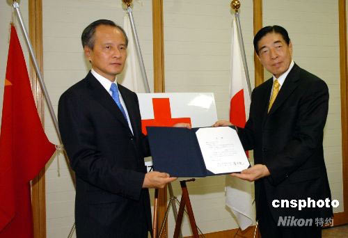 6月20日,中國駐日大使崔天凱前往位于東京的日本紅十字會代表中國政府向日本巖手宮城地震災(zāi)區(qū)提供10萬美金的救災(zāi)捐款,并再次對地震災(zāi)區(qū)人民表示慰問。圖為崔天凱與日本紅十字會會長近衛(wèi)忠煇。中新社發(fā) 朱沿華 攝
