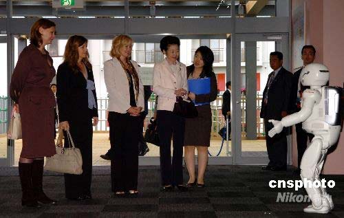 7月8日下午,在洞爺湖出席八國集團(tuán)峰會(huì)的部分國家元首夫人,在日本第一夫人貴代子的陪同下參觀峰會(huì)環(huán)保型的國際新聞中心。日本公司研制的機(jī)器人asimo在門口迎接諸位夫人的到來,并用流利的英語和夫人們進(jìn)行交流,令首腦夫人們驚喜不已。中新社發(fā) 朱沿華 攝
