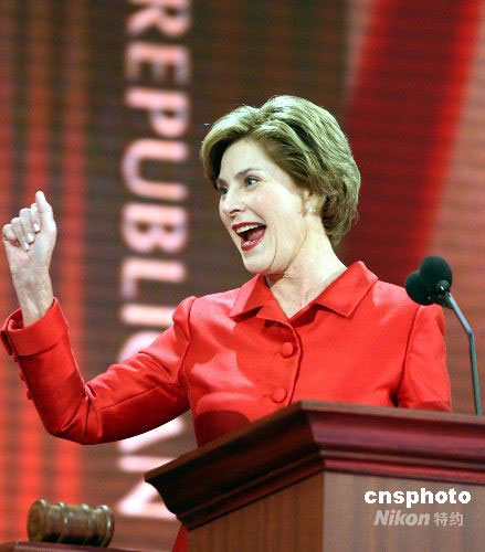 9月2日,美國第一夫人勞拉出席在明尼蘇達(dá)州州府圣保羅舉行的共和黨全國代表大會時表示,為阿拉斯加州州長薩拉·佩林有望成為美國歷史上第一位女副總統(tǒng)而感到驕傲。中新社發(fā) 李靜 攝