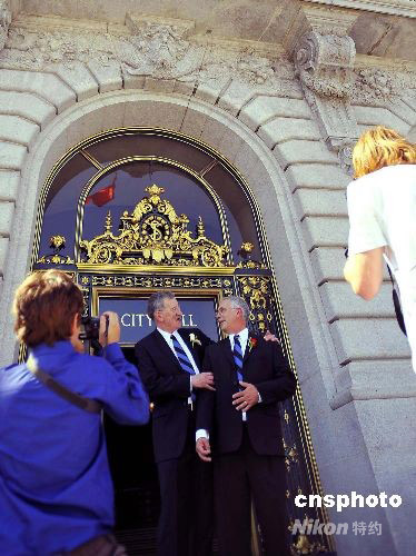 九月二十九日是美國舊金山同性戀伴侶麥卡弗和德斯勒相愛三十年的日子。三十年前的今天,他們在香港度蜜月。三十年后他們在舊金山市政府領(lǐng)取了結(jié)婚證書。加州最高法院裁定二00八年六月十六日是同性戀婚姻合法化的日子,但加州選民將在十一月再次對同性戀婚姻進(jìn)行投票表決。中新社發(fā) 陳鋼 攝