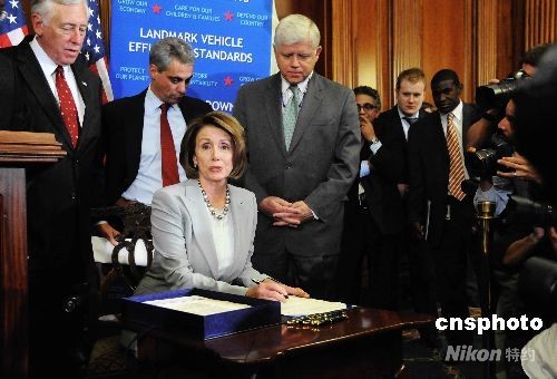 圖為眾議長南!づ迓逦鳎ㄗ撸┰趪鴷渌I(lǐng)袖的陪同下簽署了這個(gè)剛剛通過的方案。