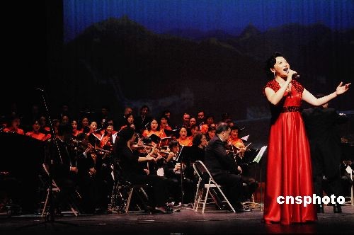 華盛頓黃河藝術(shù)團(tuán)藝術(shù)家在當(dāng)?shù)貢r間十月二十五日晚的演出中用中國改革開放歷程中涌現(xiàn)的歌曲,抒發(fā)中國人共同經(jīng)歷的改革開放不平凡的三十年,引起了海外華人強(qiáng)烈共鳴。圖為黃河藝術(shù)團(tuán)藝術(shù)家演唱《好一個中國大舞臺》贏得雷鳴掌聲。中新社發(fā) 邱江波 攝