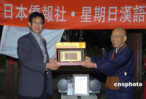 11月9日,日本僑報(bào)社創(chuàng)辦的星期日漢語角在東京西池袋公園舉行第65次交流會(huì)。會(huì)上舉行了第2屆小島康譽(yù)國際貢獻(xiàn)獎(jiǎng)?lì)C獎(jiǎng)儀式。著名日中友好人士小島康譽(yù)向?yàn)榇龠M(jìn)日中民間交流作出貢獻(xiàn)的《日本僑報(bào)》總編輯、漢語角創(chuàng)辦人段躍中頒發(fā)了一幅以中國新疆尼雅遺址出土的東漢“五星出東方利中國”古錦為原型的金箔藝術(shù)品和100萬日元。中國駐日使館友好交流參贊孫美嬌和中日兩國媒體、經(jīng)濟(jì)界、友好團(tuán)體及旅日留學(xué)生代表等約80人出席了當(dāng)天的頒獎(jiǎng)儀式。中新社發(fā) 日本僑報(bào)社 攝