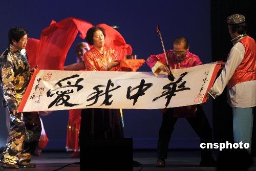 當(dāng)?shù)貢r(shí)間11月14日晚,由南加州華人聯(lián)合總會(huì)等主辦的2008洛杉磯中華藝術(shù)節(jié)拉開帷幕。中國僑聯(lián)“親情中華”藝術(shù)團(tuán)與洛杉磯華人藝術(shù)團(tuán)體共同為觀眾奉獻(xiàn)了一臺(tái)“親情中華”大型歌舞晚會(huì)。中新社發(fā) 張煒 攝