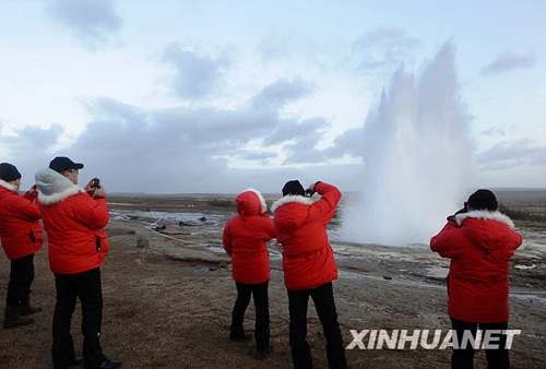 11月19日,游客在冰島首都雷克雅未克北部著名的間歇泉拍照。新華社記者 郭磊 攝
