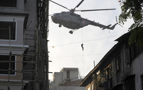 11月28日,在印度孟買,印度突擊隊員從武裝直升機(jī)上空降到納里曼大樓的樓頂。印度警方證實,印度軍警已經(jīng)從孟買市內(nèi)猶太人聚居的納里曼大樓中解救出7名人質(zhì),其中包括2名外國人,但目前還有多名人質(zhì)在武裝分子手中。