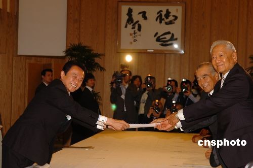 12月8日下午,日本首相麻生太郎在位于東京的首相官邸會見了新一屆中日友好21世紀委員會的中日兩國委員并接受了該委員會提交的最終工作報告。圖為中方首席委員鄭必堅和日方首席委員小林陽太郎共同向麻生首相提交工作報告。中新社發(fā) 朱沿華 攝