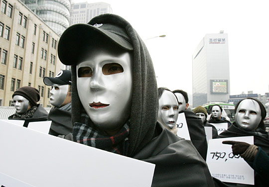 1月16日,韓國(guó)一些民眾頭帶面具聚集在首爾以色列使館前進(jìn)行示威,抗議以色列襲擊加沙。