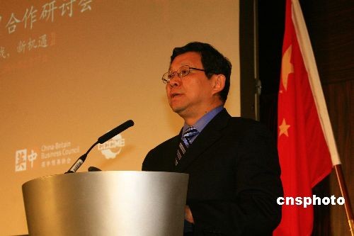 當?shù)貢r間2月27日下午,中國機電進出口商會和英中貿(mào)易協(xié)會在倫敦共同舉辦中英經(jīng)貿(mào)合作研討會,中英兩國企業(yè)界人士600多人與會。圖為中國商務(wù)部長陳德銘在研討會上致辭。中新社發(fā) 李鵬 攝